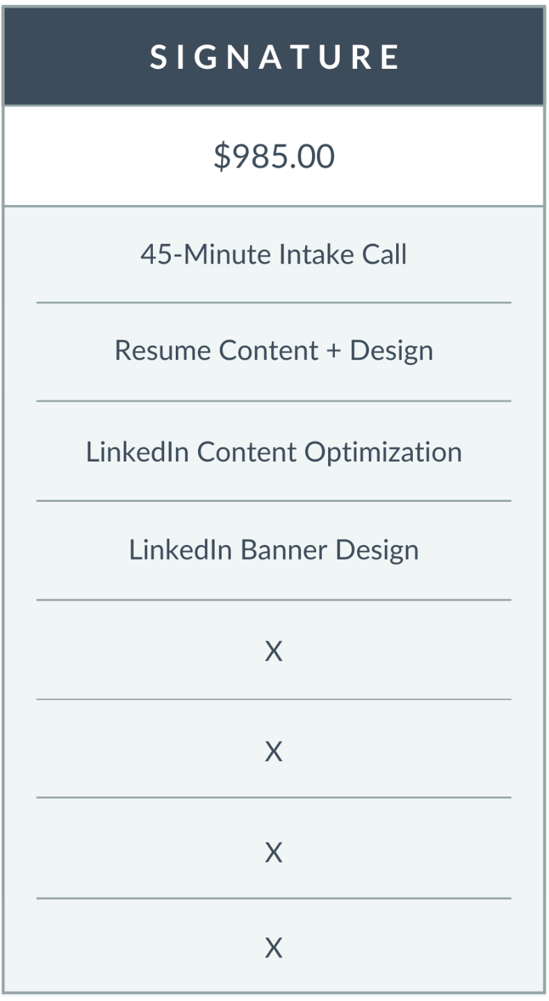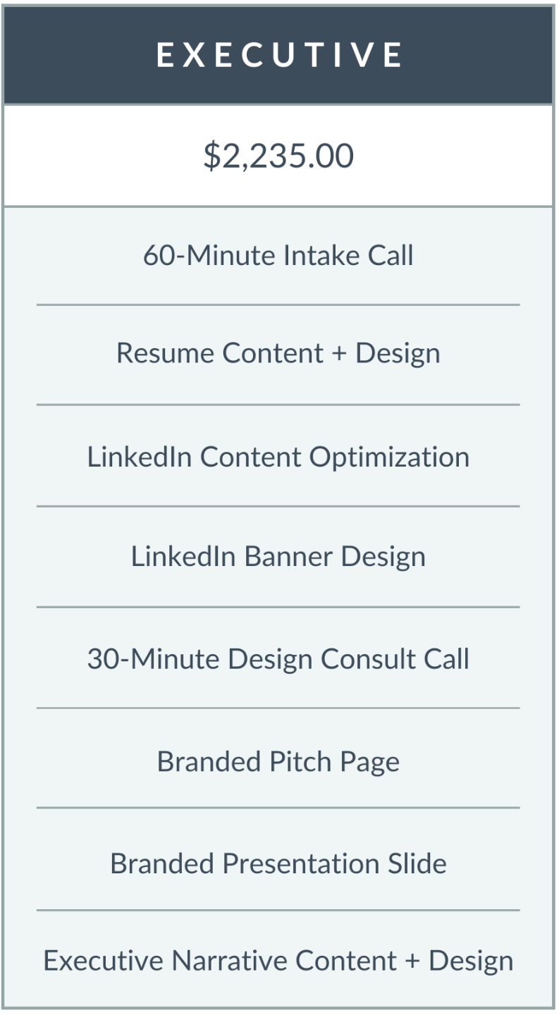 To get started, select the package below that best fits your needs and click “sign up” to be connected with your personal resume writer, professional designer, and/or career coach!Â